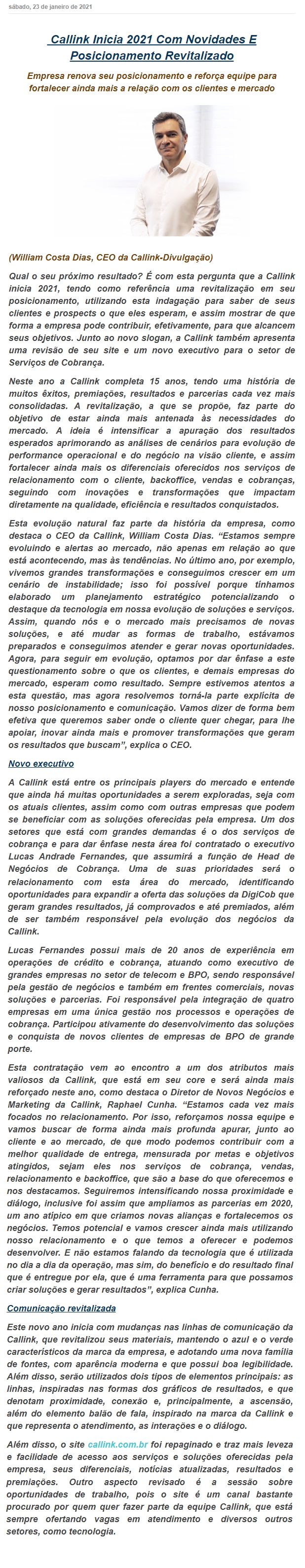 ONLINE - Callink inicia 2021 com novidades e posicionamento revitalizado - 23/01