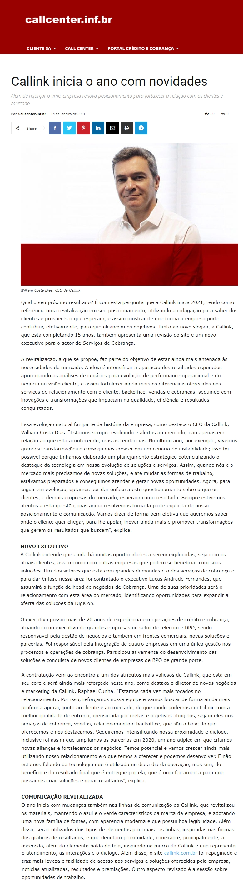 ONLINE - Callink inicia o ano com novidades - 14/01