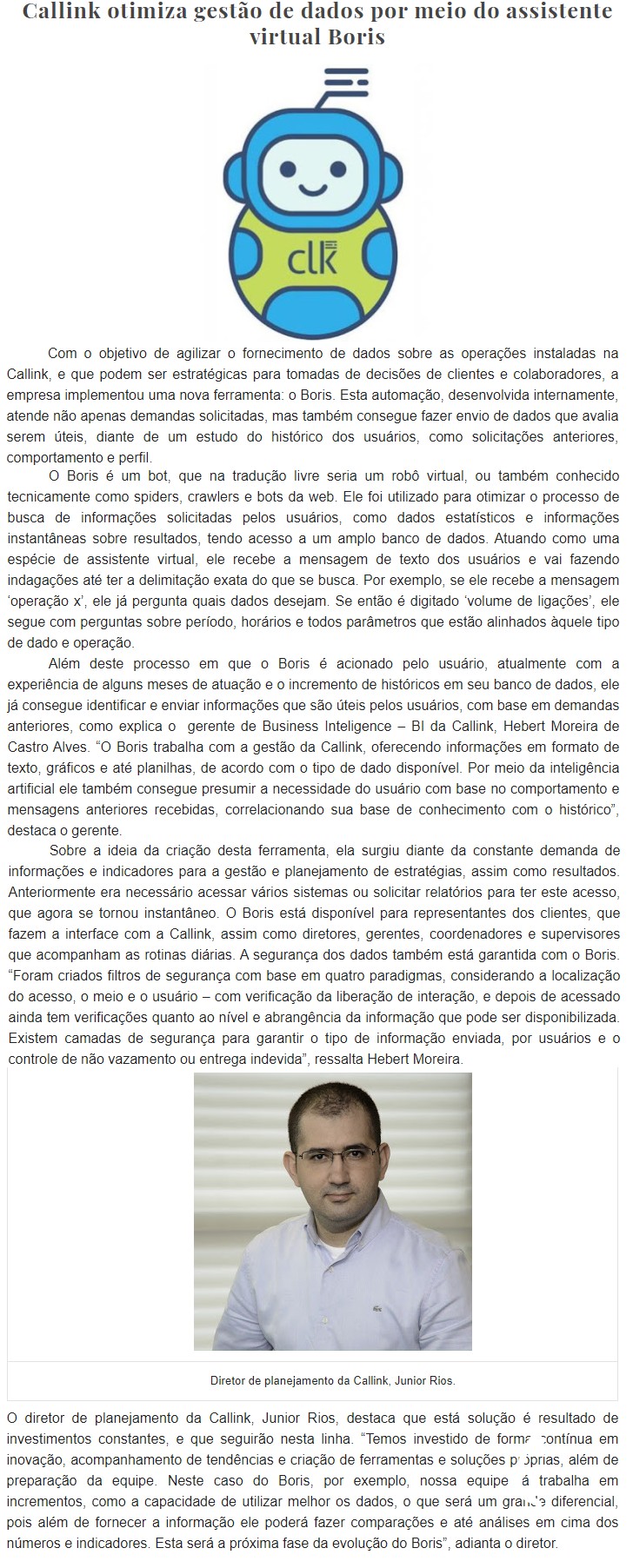 ONLINE - Callink otimiza gestão de dados por meio do assistente virtual Boris (09/10)