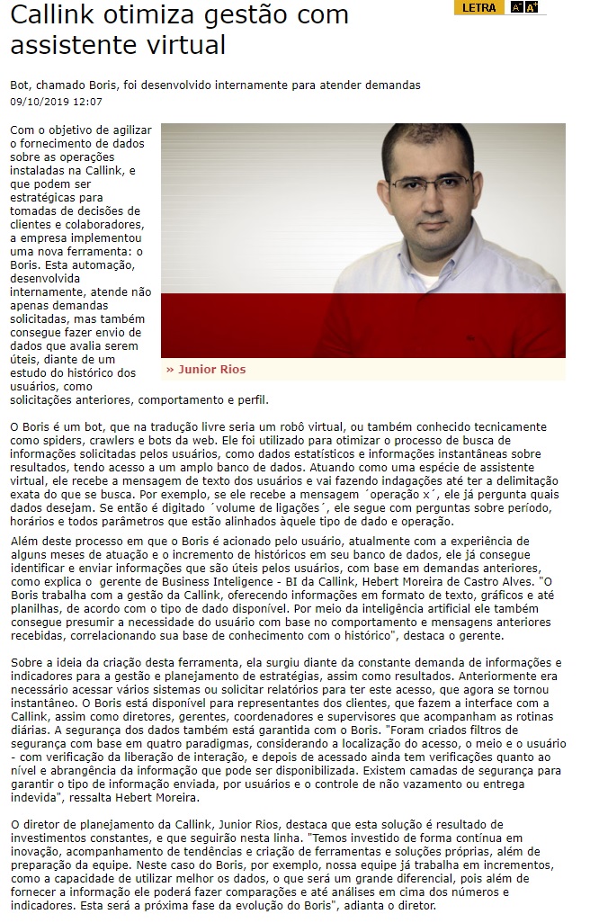 ONLINE - Callink otimiza gestão de dados por meio do assistente virtual Boris - Callink - (09/10)