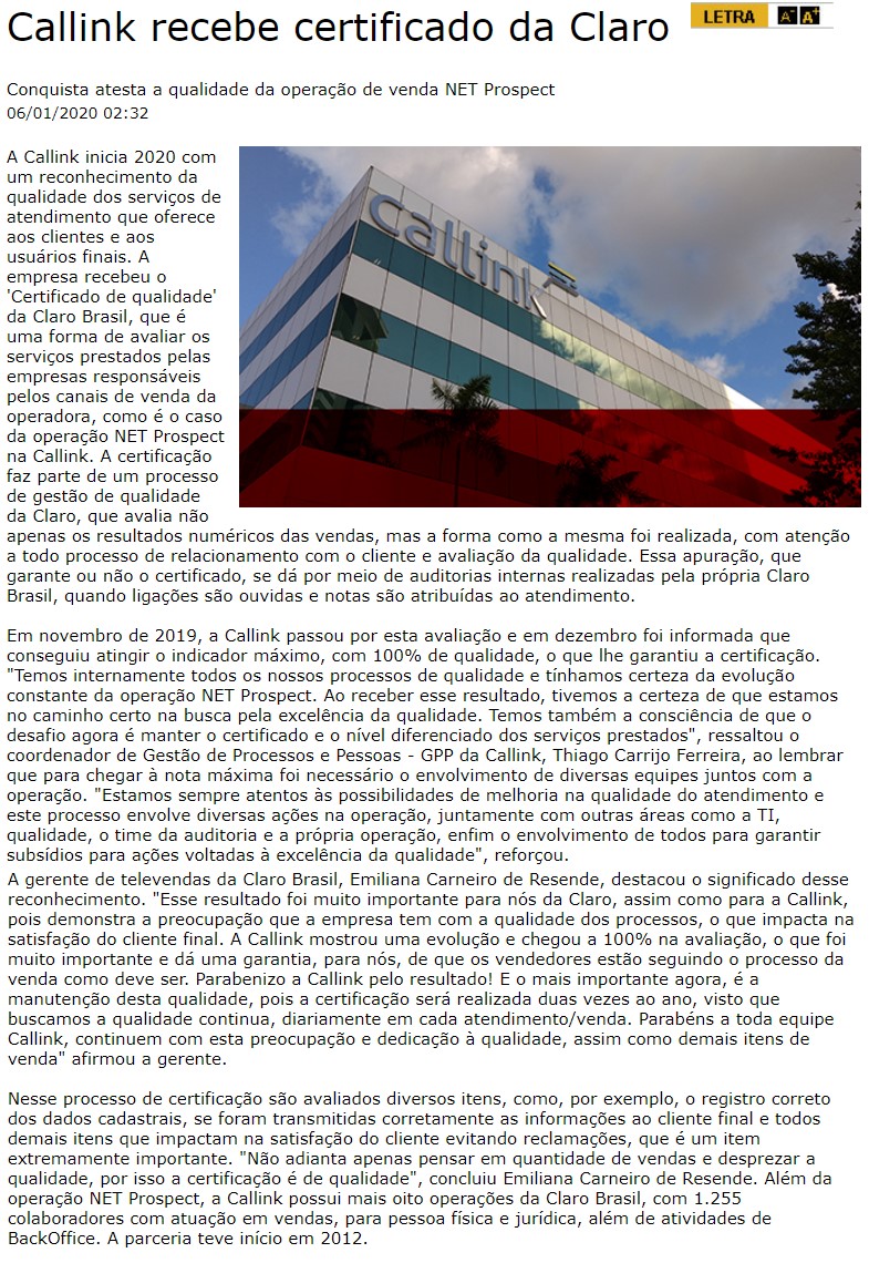 ONLINE - Callink recebe certificado da Claro - 06/01