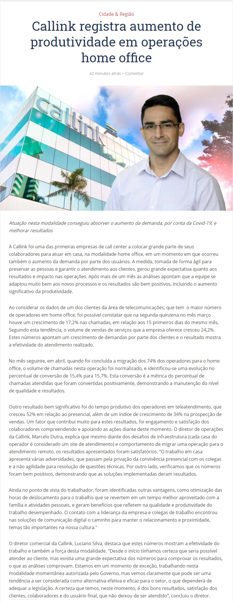 ONLINE - Callink registra aumento de produtividade em operações home office - (29/05)