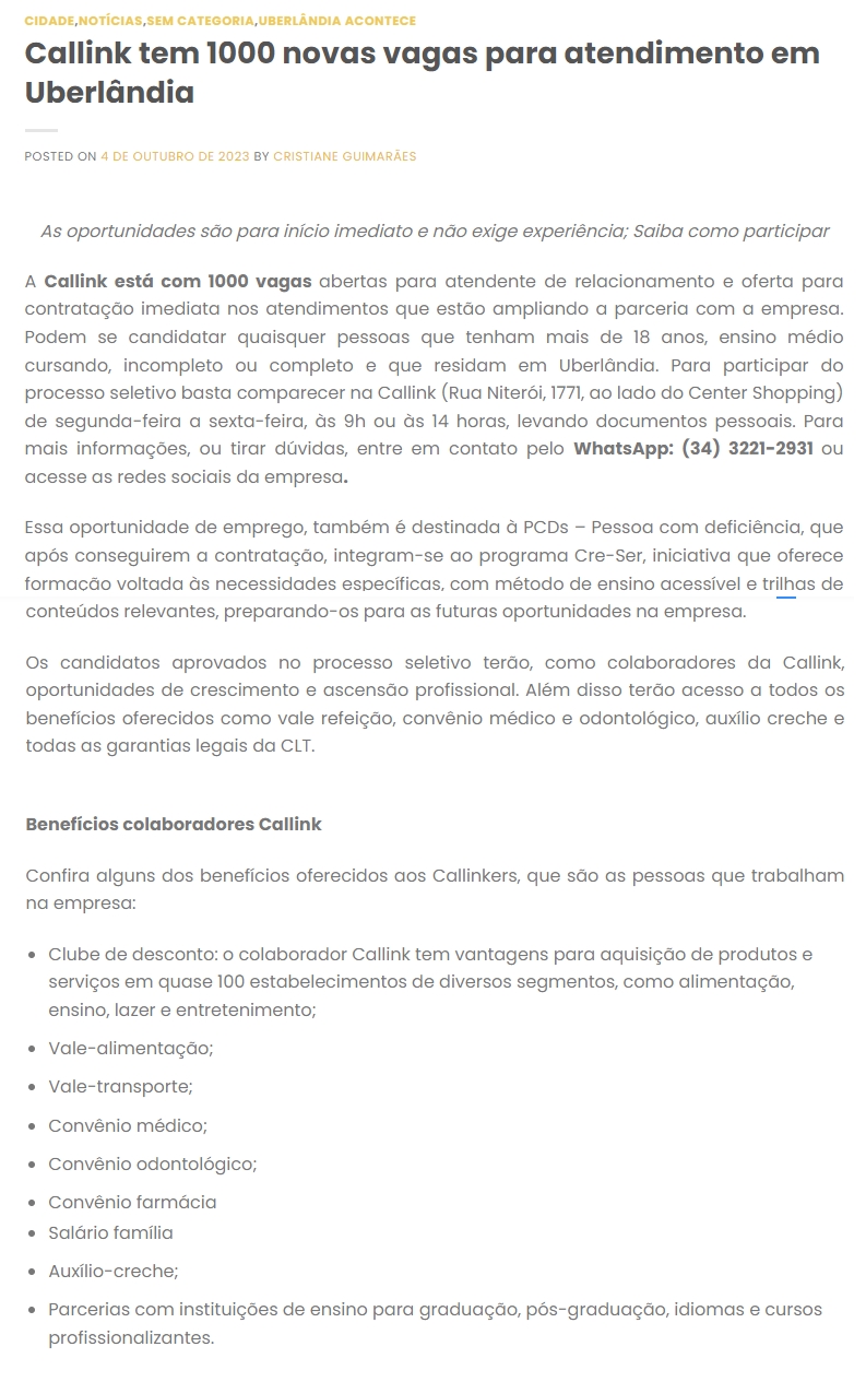 ONLINE - Callink tem 1000 novas vagas para atendimento em Uberlāndia - 04.10