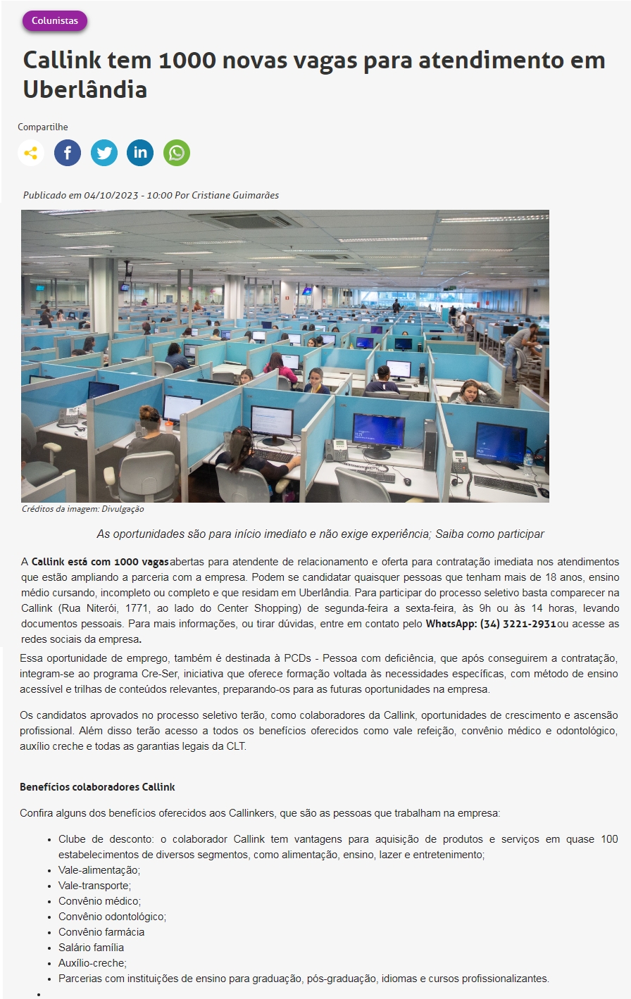 ONLINE - Callink tem 1000 novas vagas para atendimento em Uberlāndia-04.10