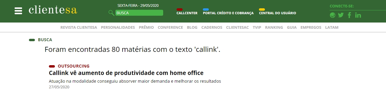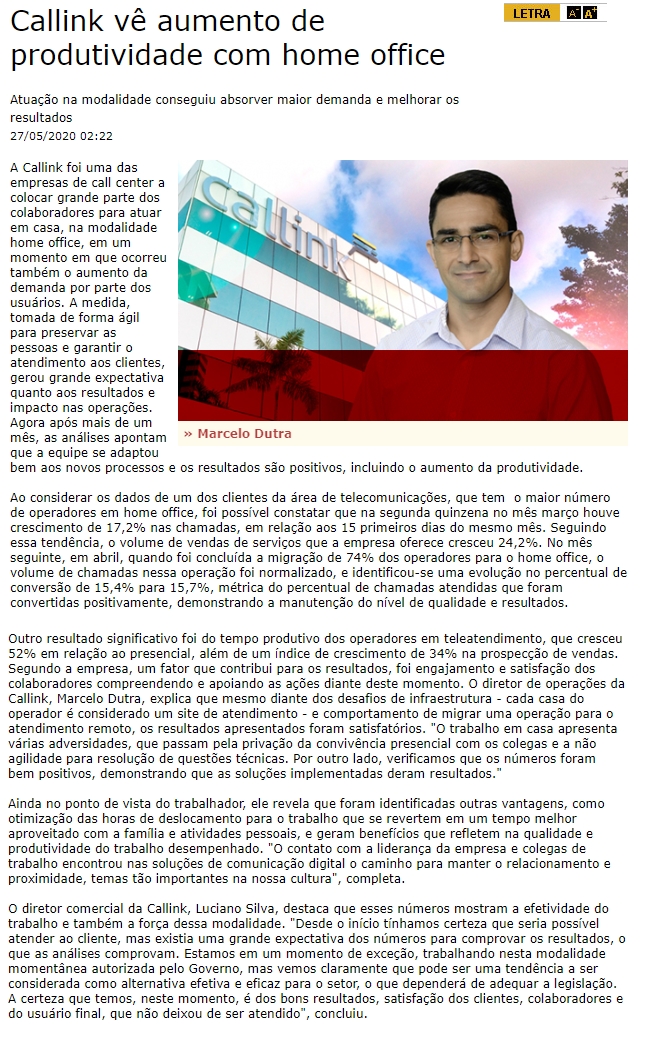 ONLINE - Callink vê aumento de produtividade com home office - (27/05)