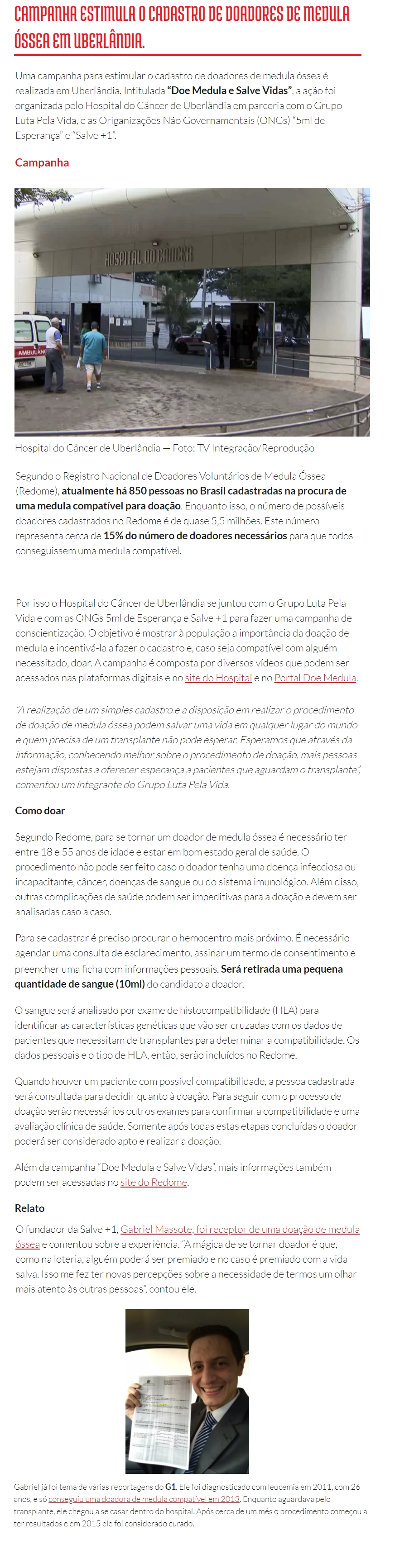 ONLINE - CAMPANHA ESTIMULA O CADASTRO DE DOADORES DE MEDULA ÓSSEA EM UBERLÂNDIA - 21.06