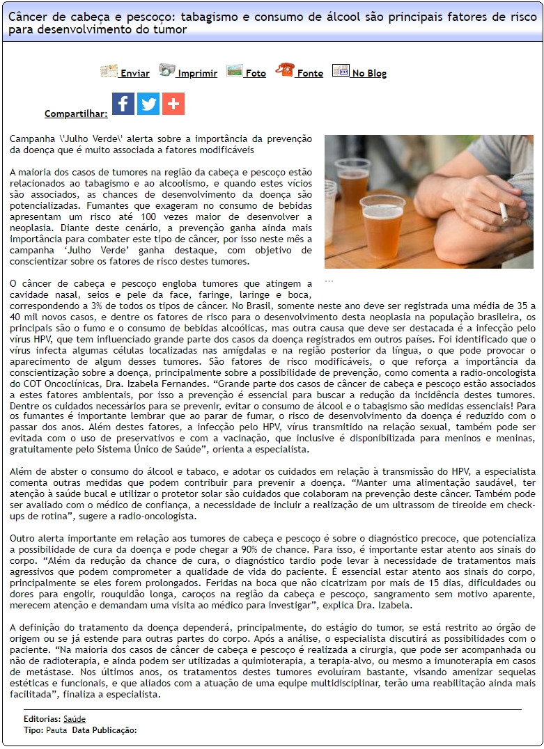 ONLINE-Câncer de cabeça e pescoço: tabagismo e consumo de álcool são principais fatores de risco para desenvolvimento do tumor-28.07
