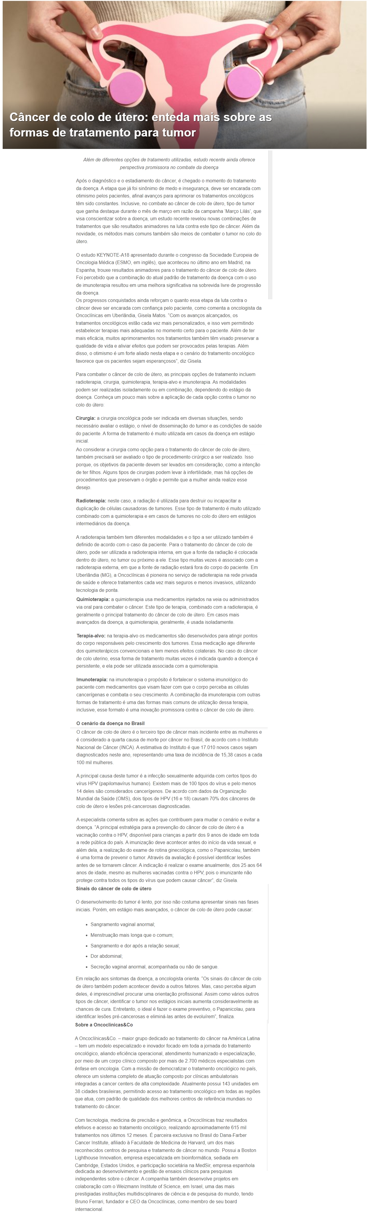 ONLINE - Câncer de colo de útero: entenda mais sobre as formas de tratamento para o tumor - 06.03