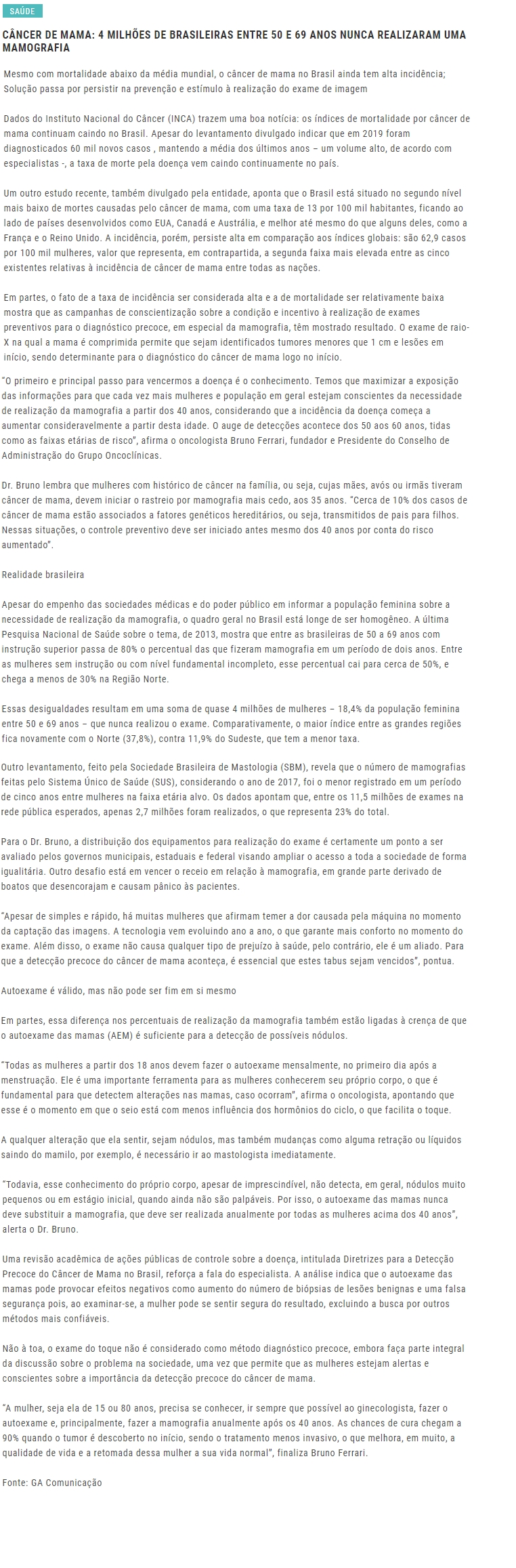 ONLINE - Câncer de Mama: 4 milhões de brasileiras entre 50 e 69 anos nunca realizaram uma mamografia - (03/02)