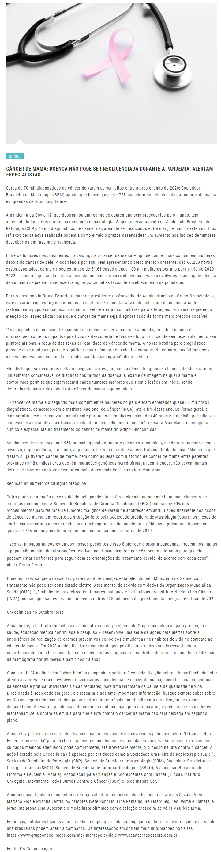 ONLINE - Câncer de mama: doença não pode ser negligenciada durante a pandemia, alertam especialistas - 02.10