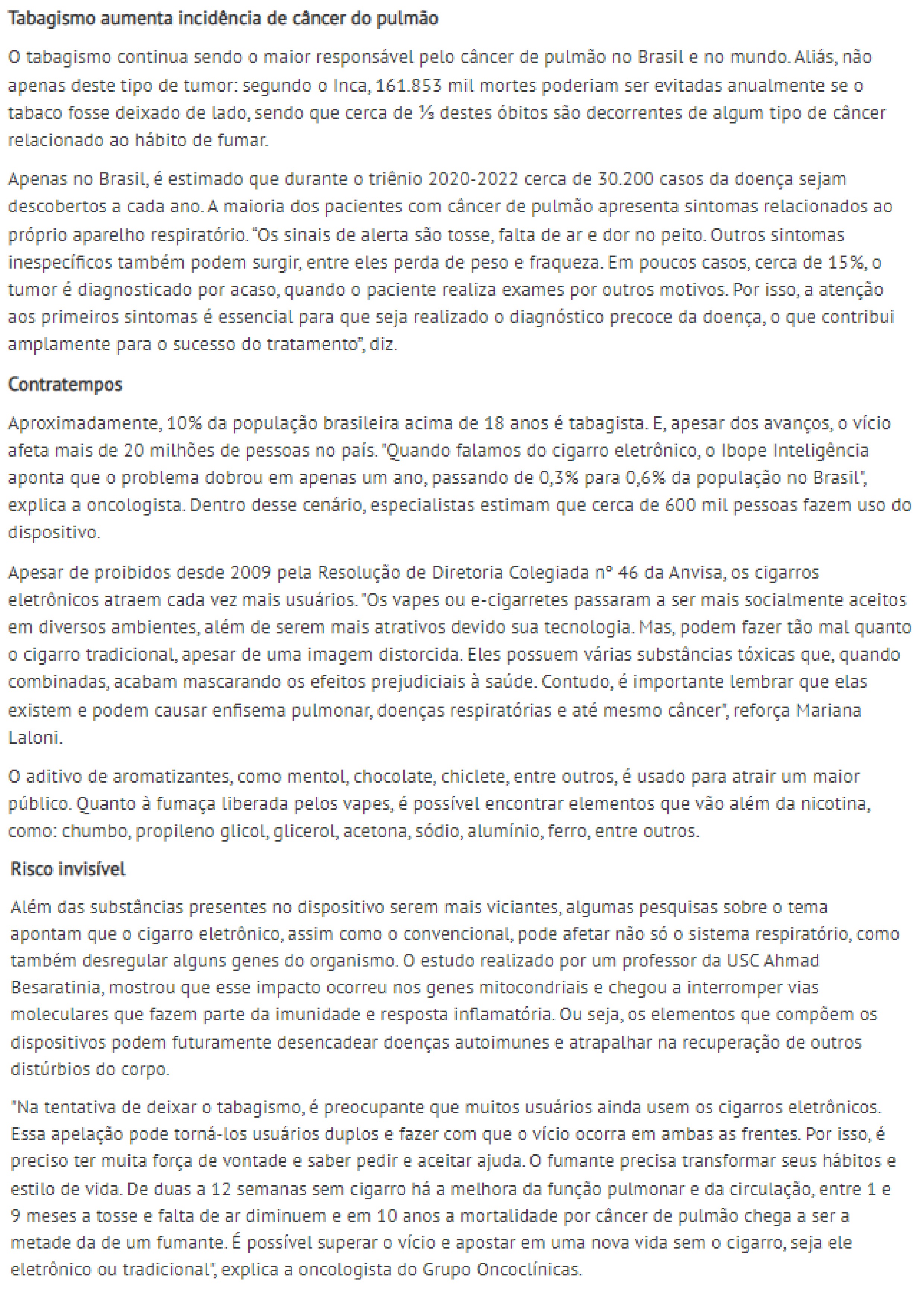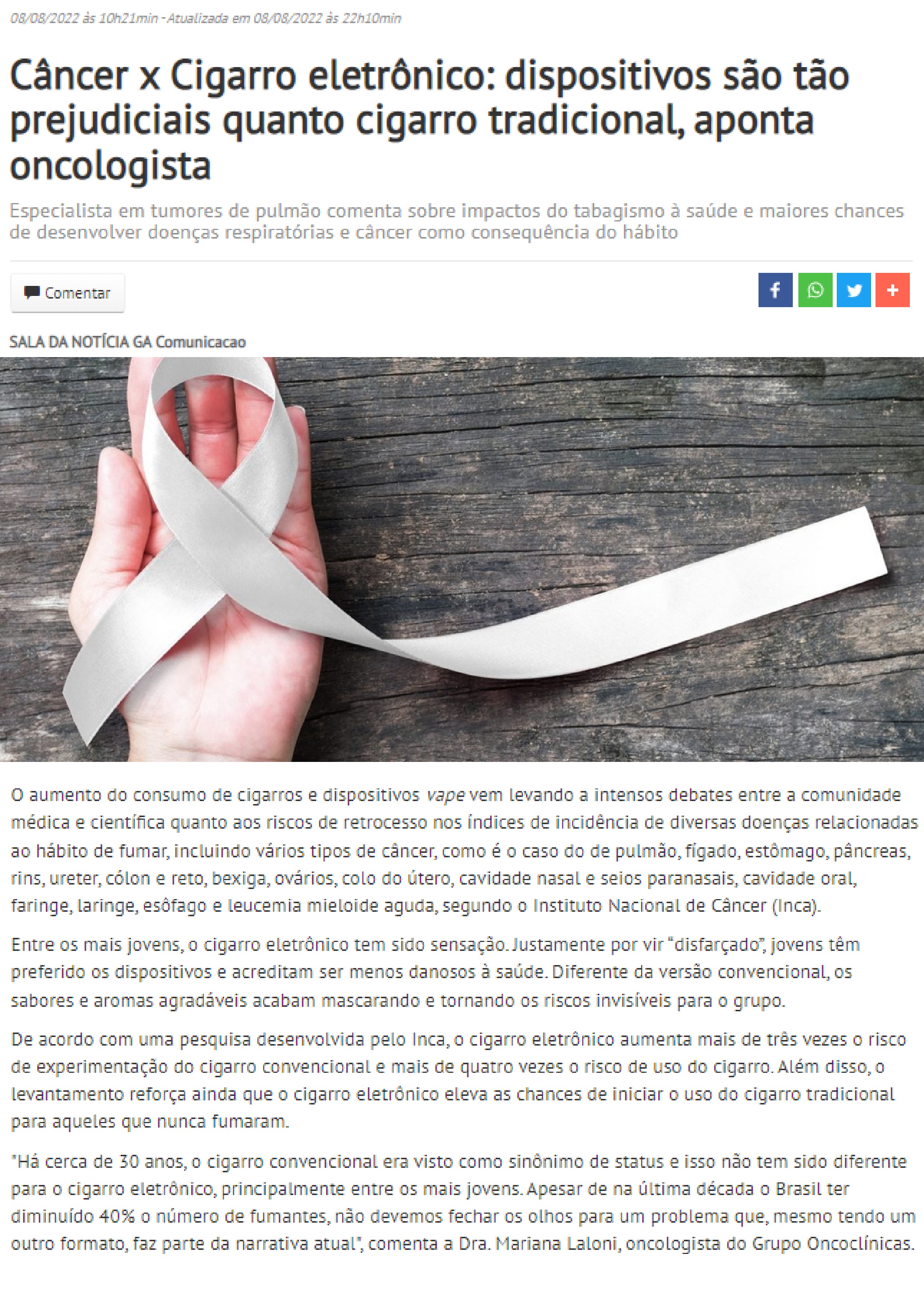 ONLINE - Câncer x Cigarro eletrônico: dispositivos são tão prejudiciais quanto cigarro tradicional, aponta oncologista - 08.08