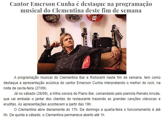 ONLINE - Cantor Emerson Cunha é destaque na programação musical do Clementina deste fim de semana (27/09)