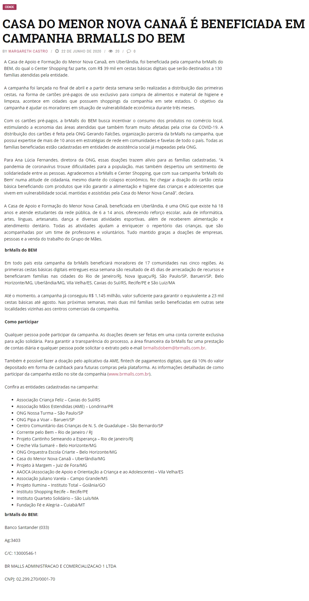 ONLINE - CASA DO MENOR NOVA CANAÃ É BENEFICIADA EM CAMPANHA BRMALLS DO BEM - (23/06)