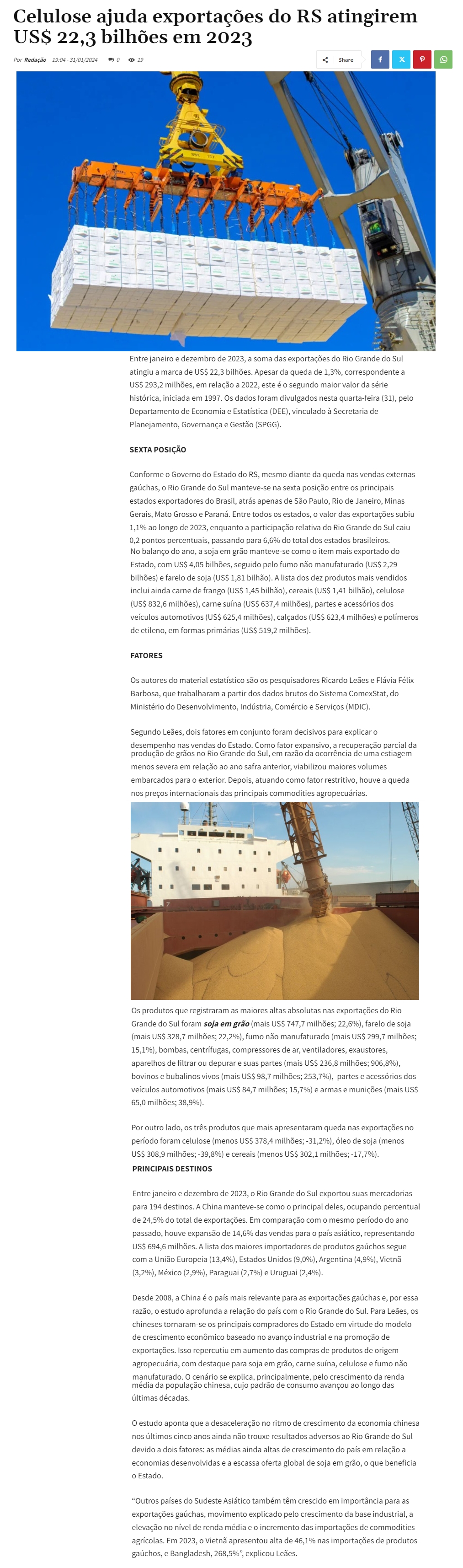 ONLINE - Celulose ajuda exportações do RS atingirem US$ 22,3 bilhões em 2023- 31.01