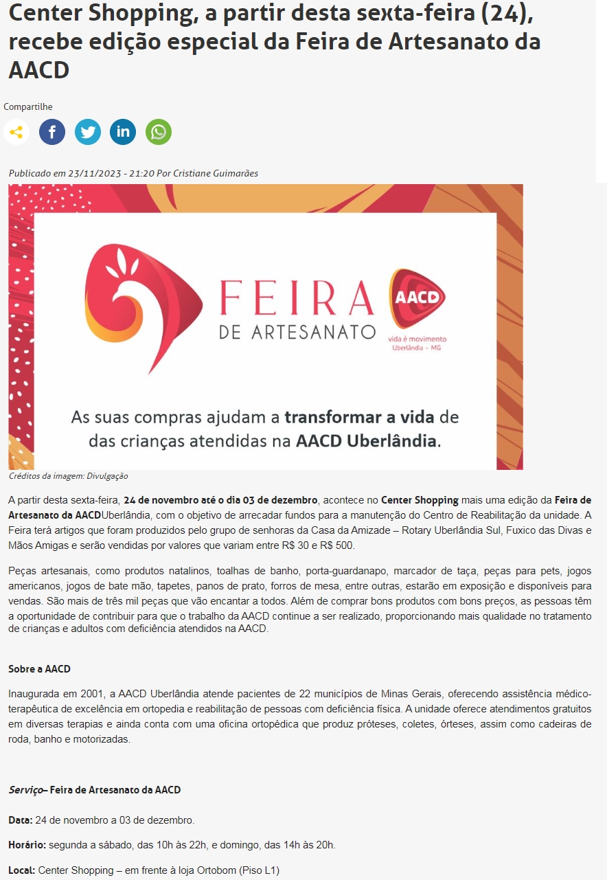 ONLINE - Center Shopping, a partir desta sexta-feira (24), recebe edição especial da Feira de Artesanato da AACD-23.11