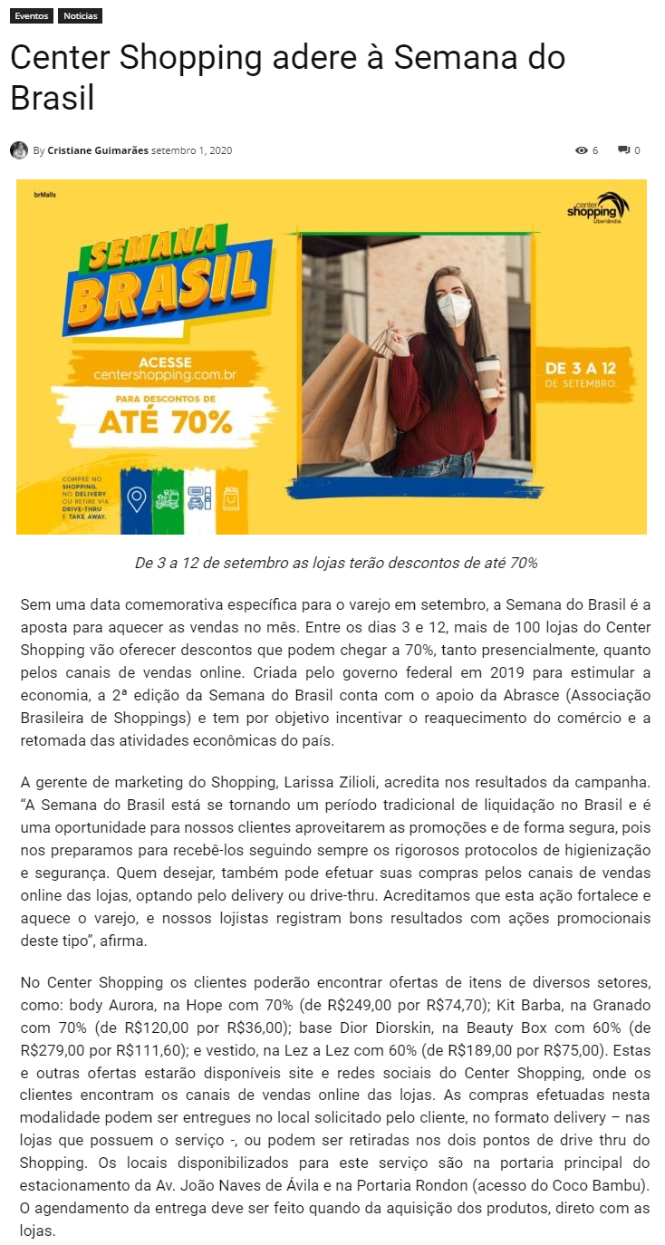 ONLINE - Center Shopping adere à Semana do Brasil - (01/09)