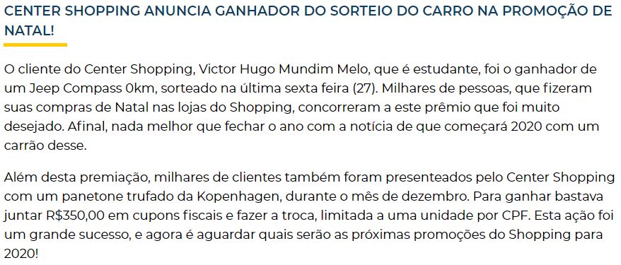 ONLINE - Center Shopping anuncia ganhador do sorteio do carro na promoção de Natal! -