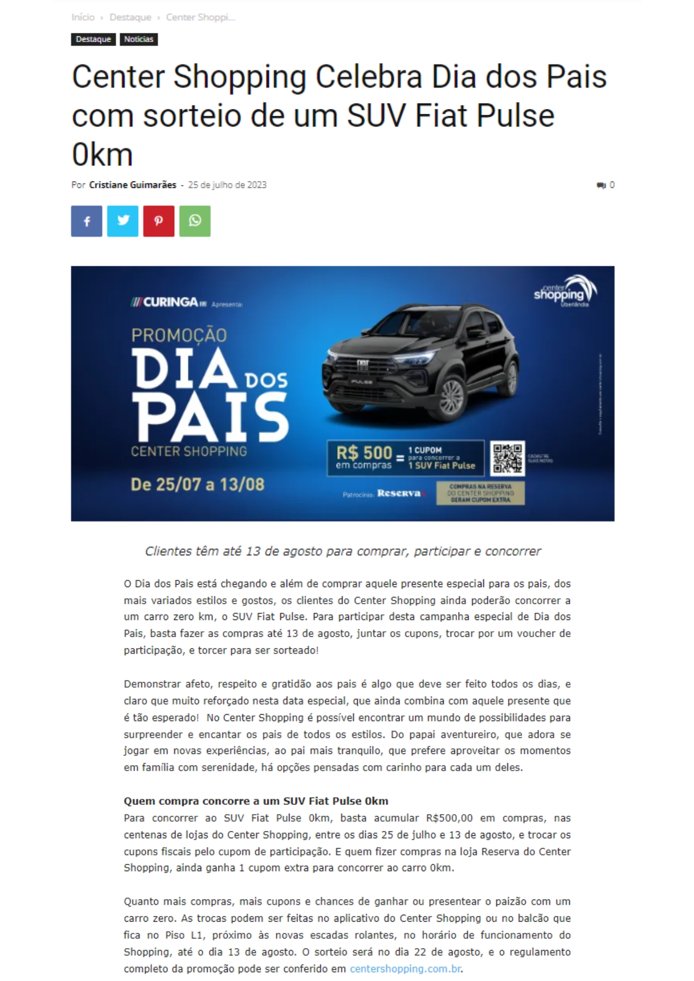 ONLINE - Center Shopping Celebra Dia dos Pais com sorteio de um SUV Fiat Pulse 0km - 25.07