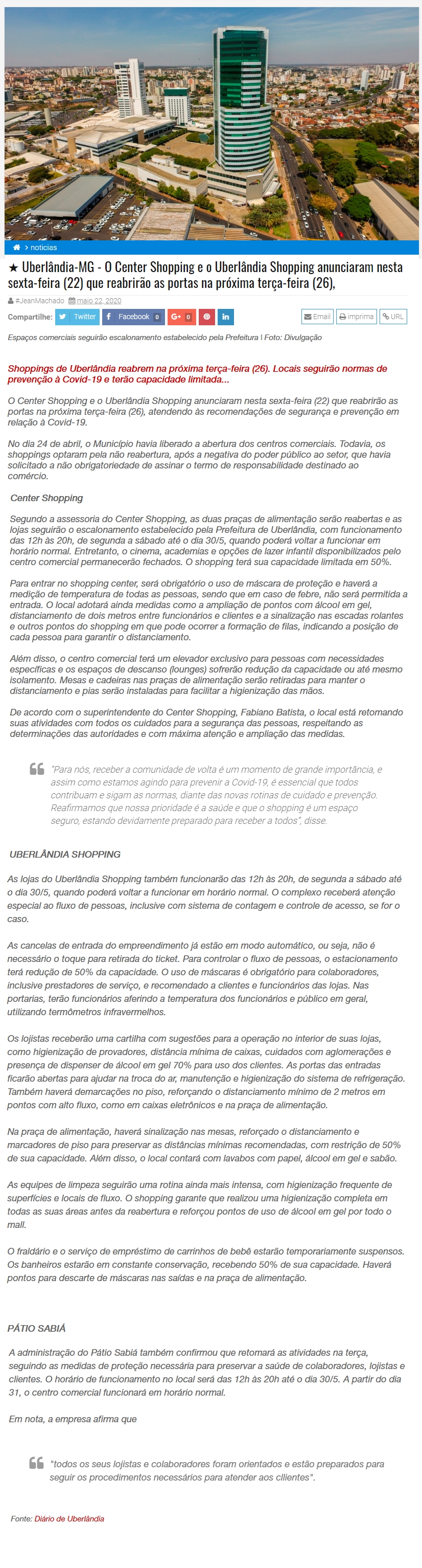 ONLINE - Center Shopping e o Uberlândia Shopping anunciaram nesta sexta-feira (22) que reabrirão as portas na próxima terça-feira (26) - (22/05)