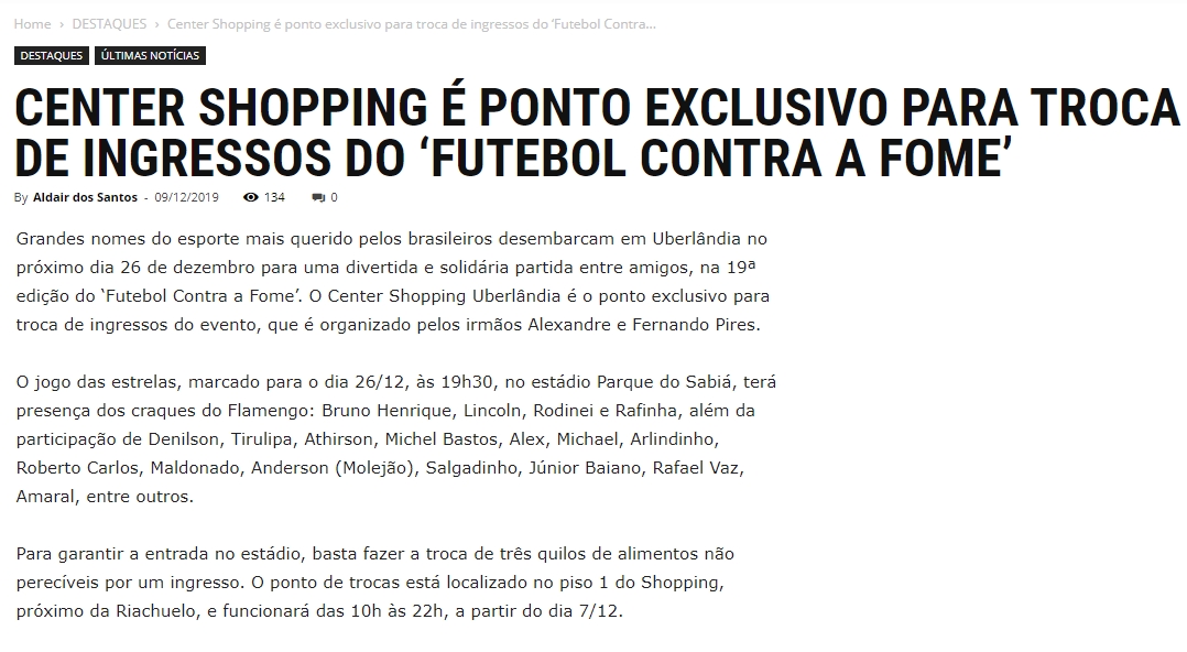 ONLINE - Center Shopping é ponto exclusivo para troca de ingressos do 'Futebol Contra a Fome' - (09/12)