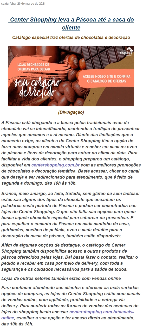 ONLINE - Center Shopping leva a Páscoa até a casa do cliente - 26.03
