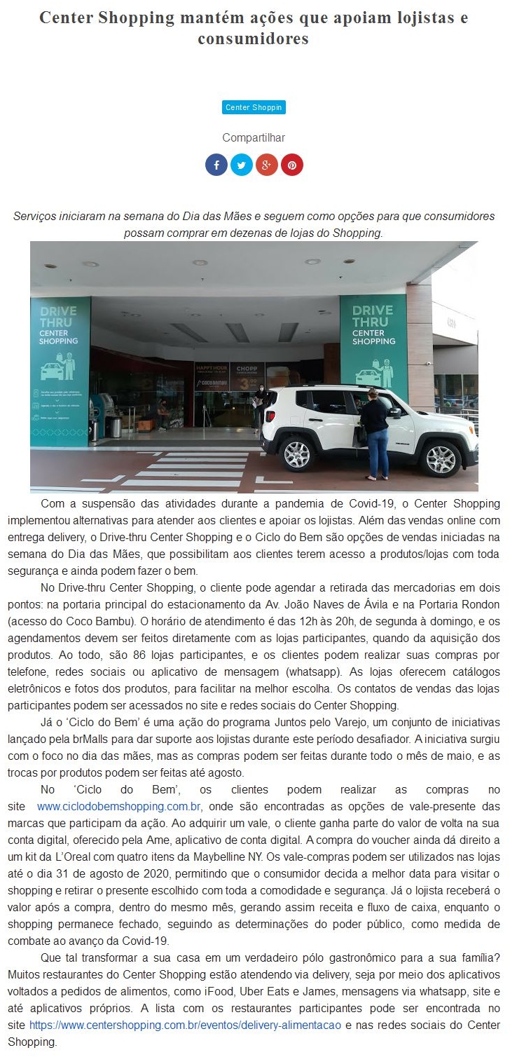 ONLINE - Center Shopping mantém ações que apoiam lojistas e consumidores - 18/05