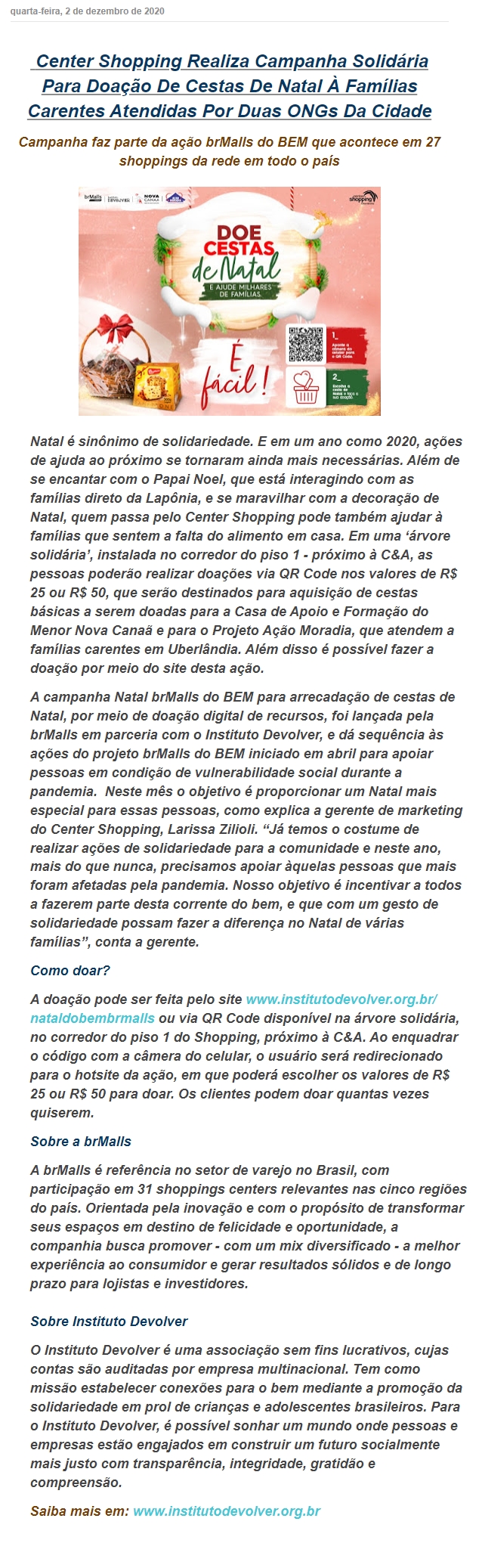 ONLINE -Center Shopping realiza campanha solidária para doação de cestas de Natal à famílias carentes atendidas por duas ONGs da cidade - 02/12
