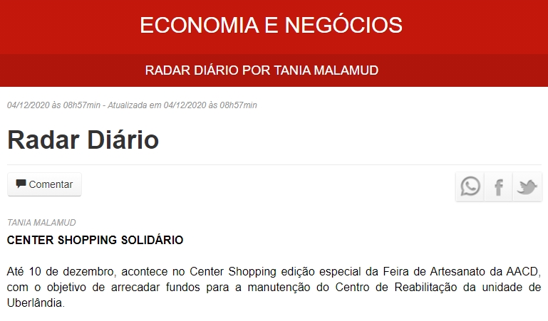 ONLINE - Center Shopping recebe edição especial da Feira de Artesanato da AACD - 04/12