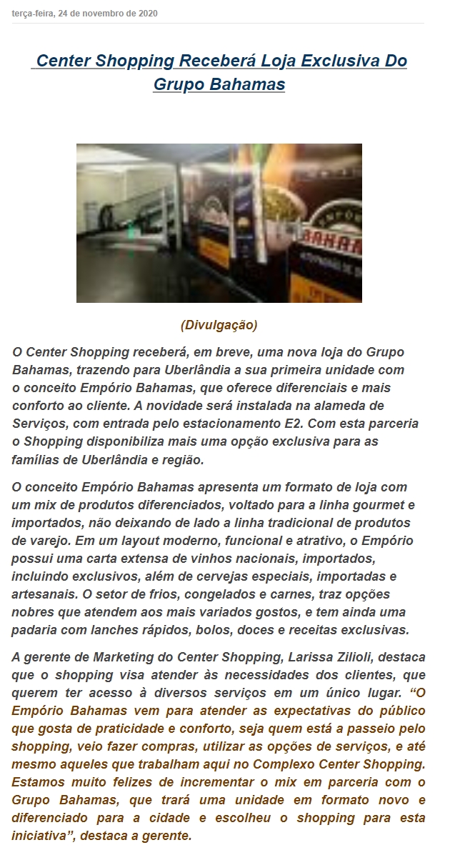ONLINE - Center Shopping receberá loja exclusiva do Grupo Bahamas - 24/11