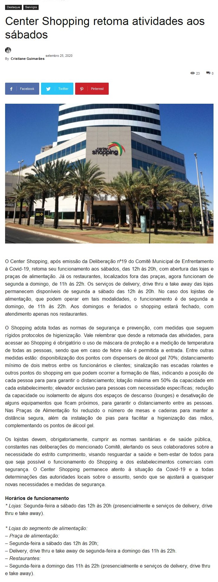 ONLINE - Center Shopping retoma atividades aos sábados - 25/09