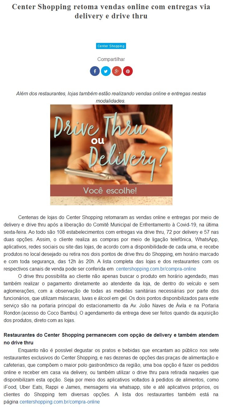 ONLINE - Center Shopping retoma vendas online com entregas via delivery e drive thru - 07/07