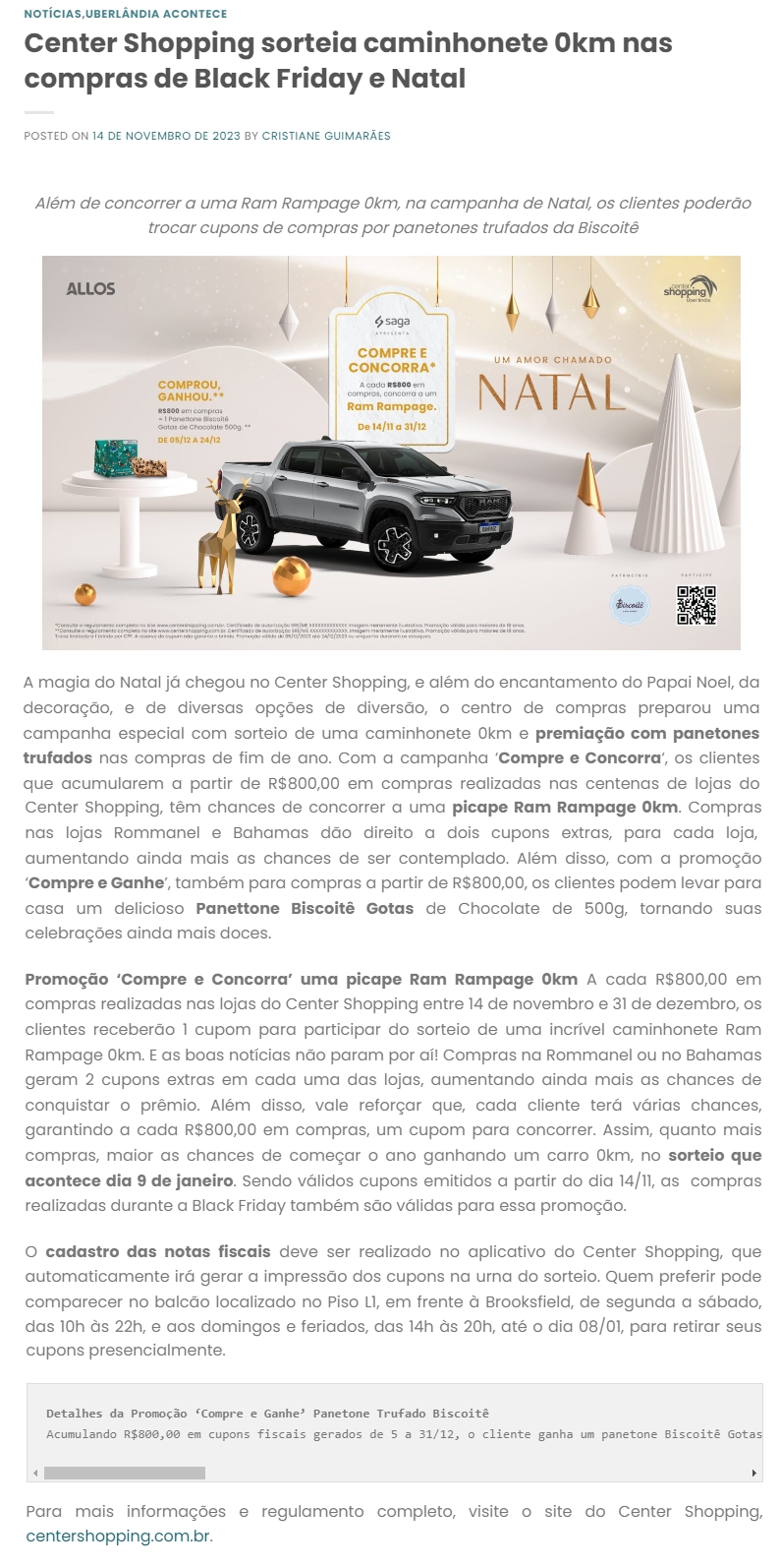 ONLINE - Center Shopping sorteia caminhonete 0km nas compras de Black Friday e Natal - 14.11