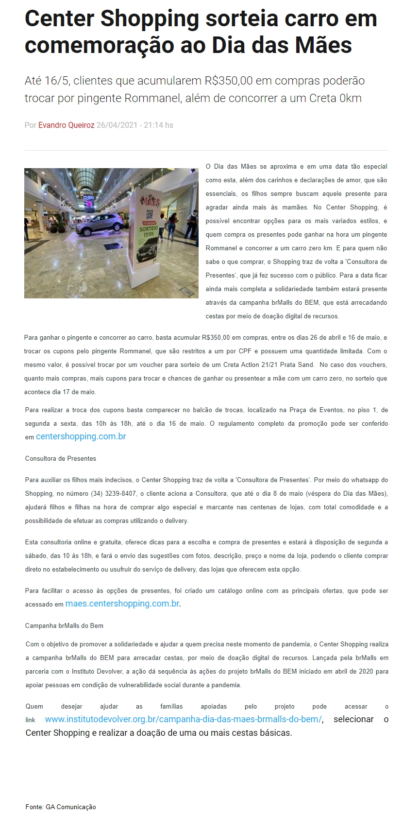 ONLINE - Center Shopping sorteia carro em comemoração ao Dia das Mães - 26.04
