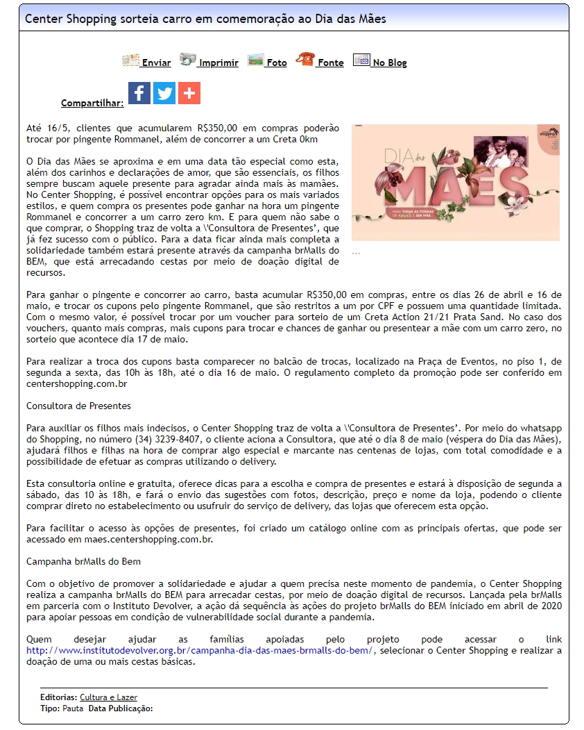 ONLINE - Center Shopping sorteia carro em comemoração ao Dia das Mães - 27/04