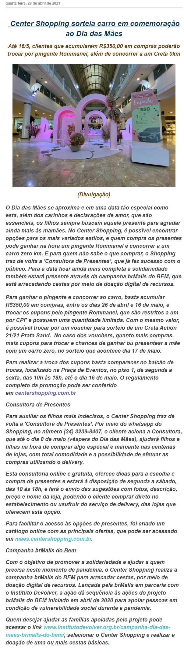 ONLINE - Center Shopping sorteia carro em comemoração ao Dia das Mães - 28.04