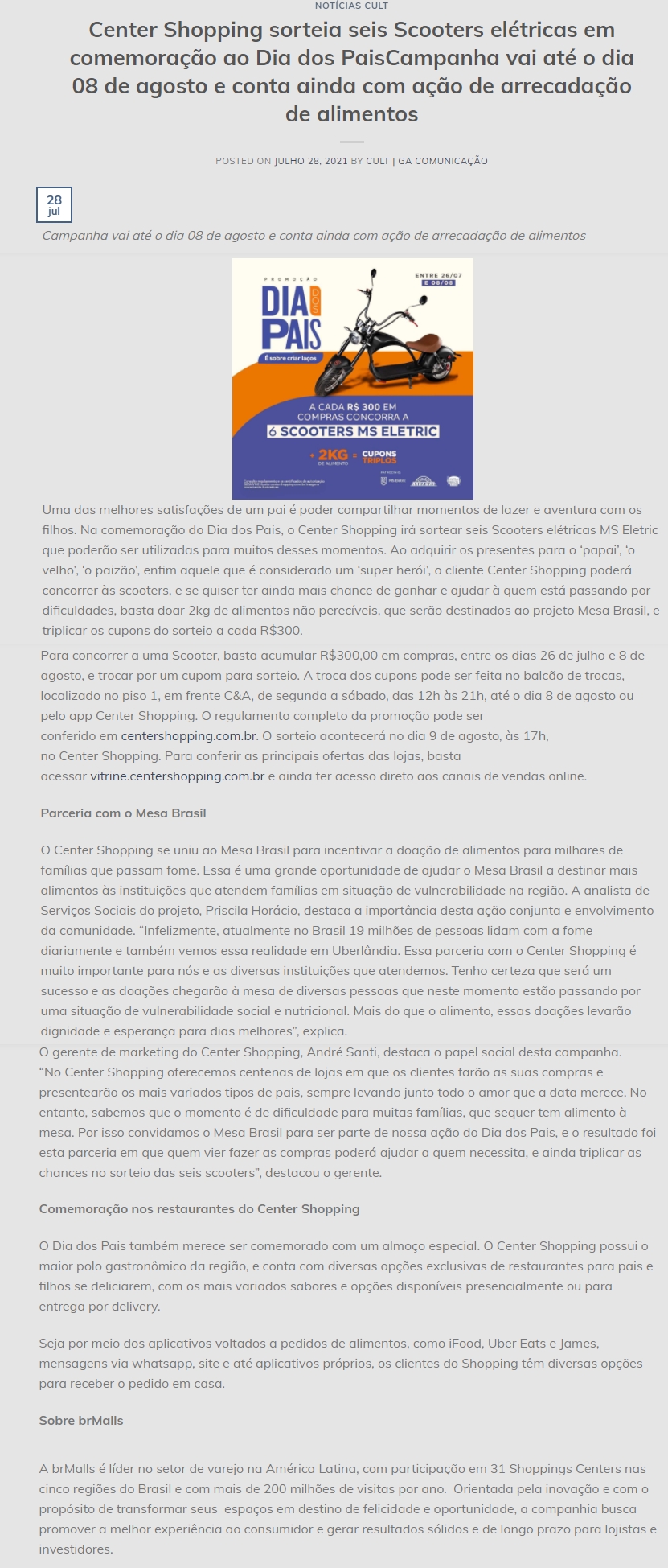 ONLINE-Center Shopping sorteia seis Scooters elétricas em comemoração ao Dia dos Pais Campanha vai até o dia 08 de agosto - 28.07