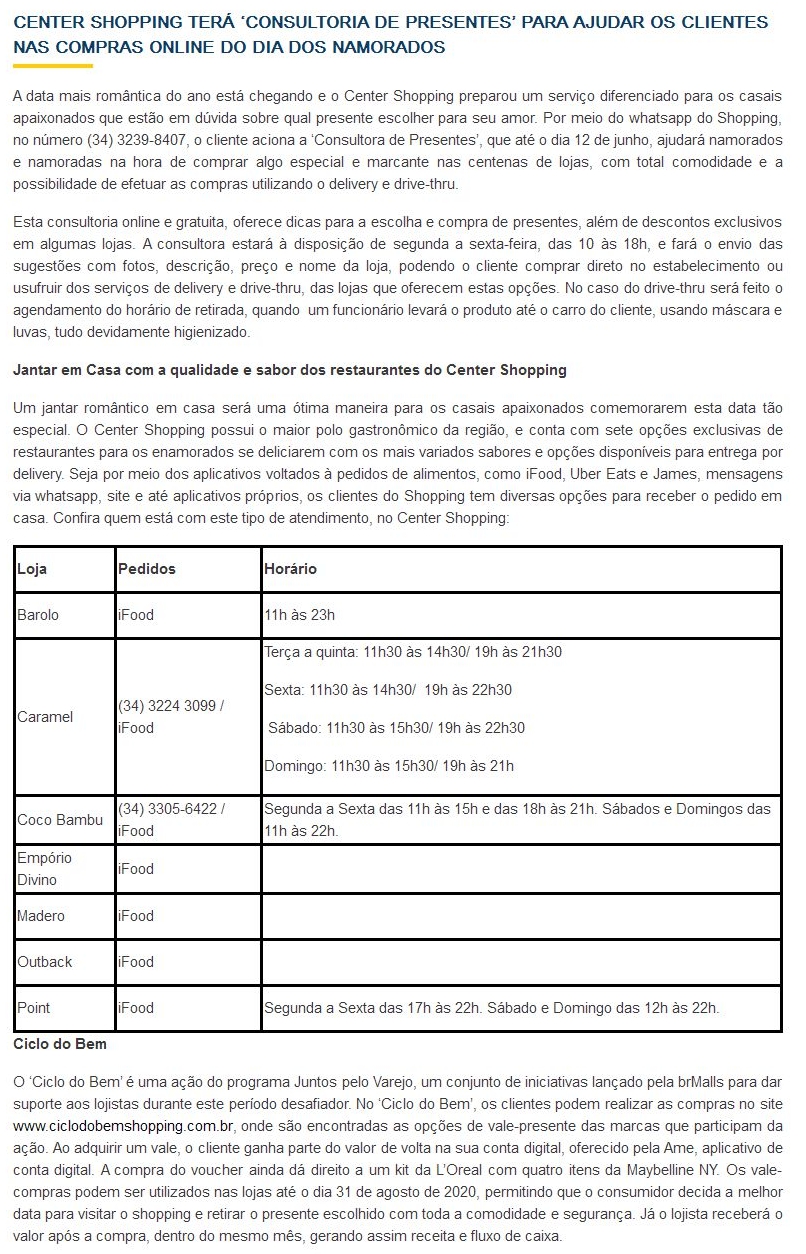 ONLINE - CENTER SHOPPING TERÁ ‘CONSULTORIA DE PRESENTES’ PARA AJUDAR OS CLIENTES NAS COMPRAS ONLINE DO DIA DOS NAMORADOS - 10/06