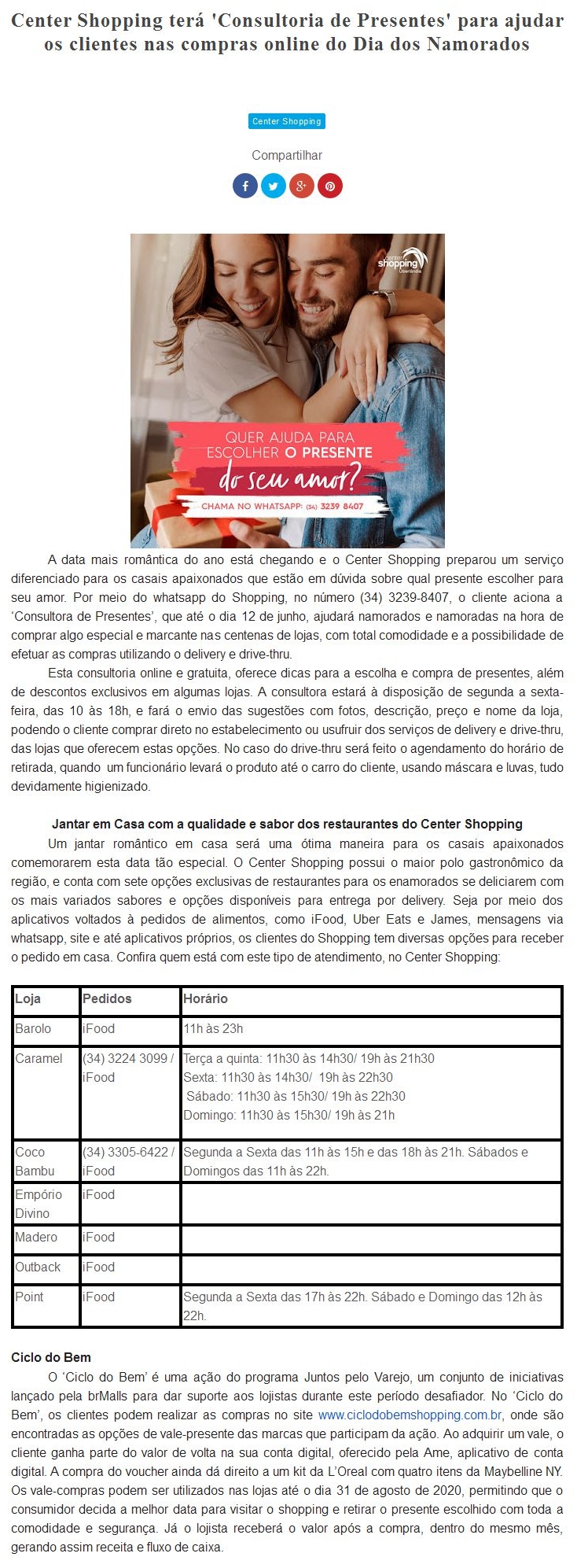 ONLINE - Center Shopping terá 'Consultoria de Presentes' para ajudar os clientes nas compras online do Dia dos Namorados - 08/06