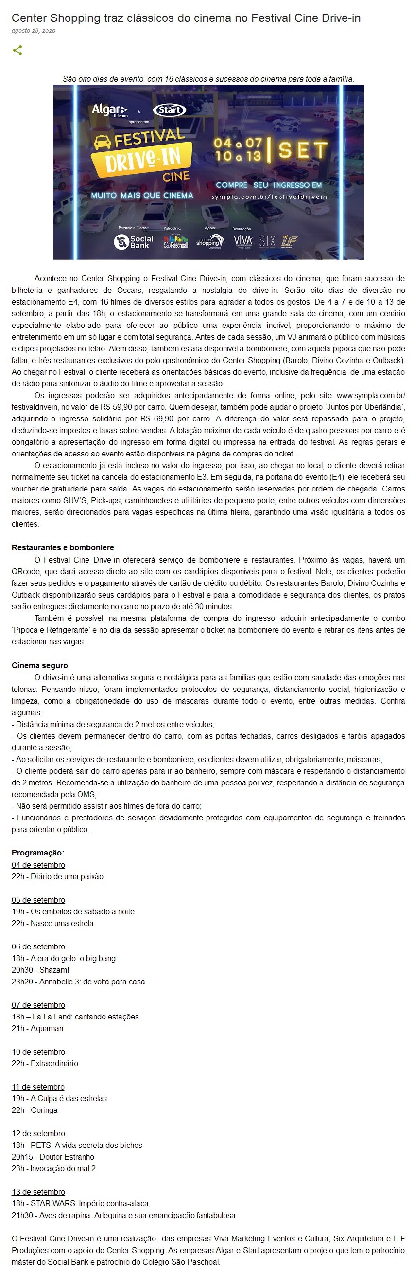 ONLINE - Center Shopping traz clássicos do cinema no Festival Cine Drive-in - 28/08