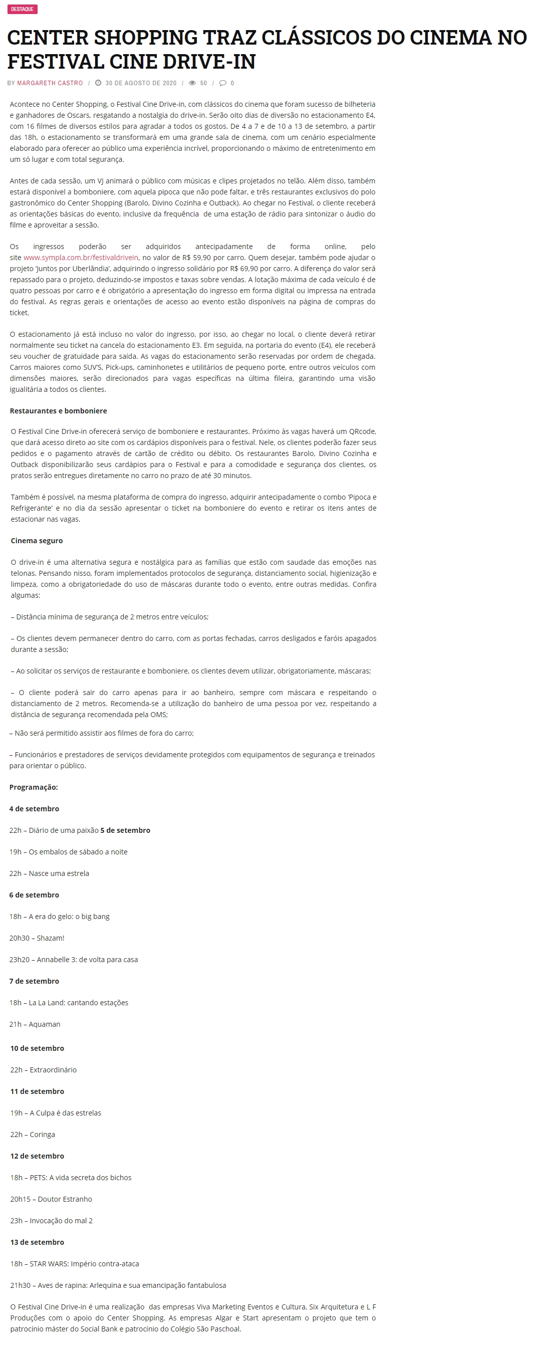 ONLINE - Center Shopping traz clįssicos do cinema no Festival Cine Drive-in - (30/08)