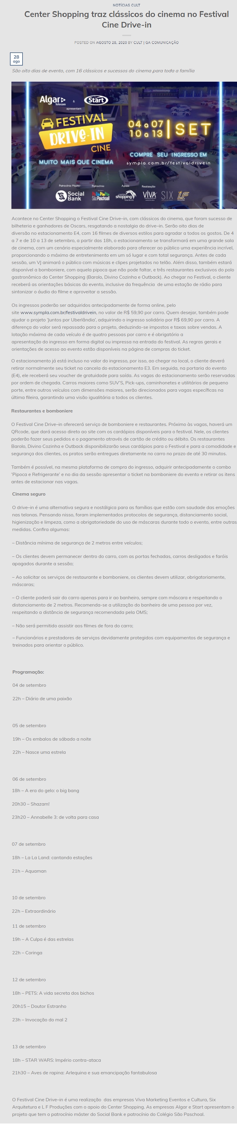 ONLINE - Center Shopping traz clássicos do cinema no Festival Cine Drive-in - Patrocínio Social Bank - (28/08)