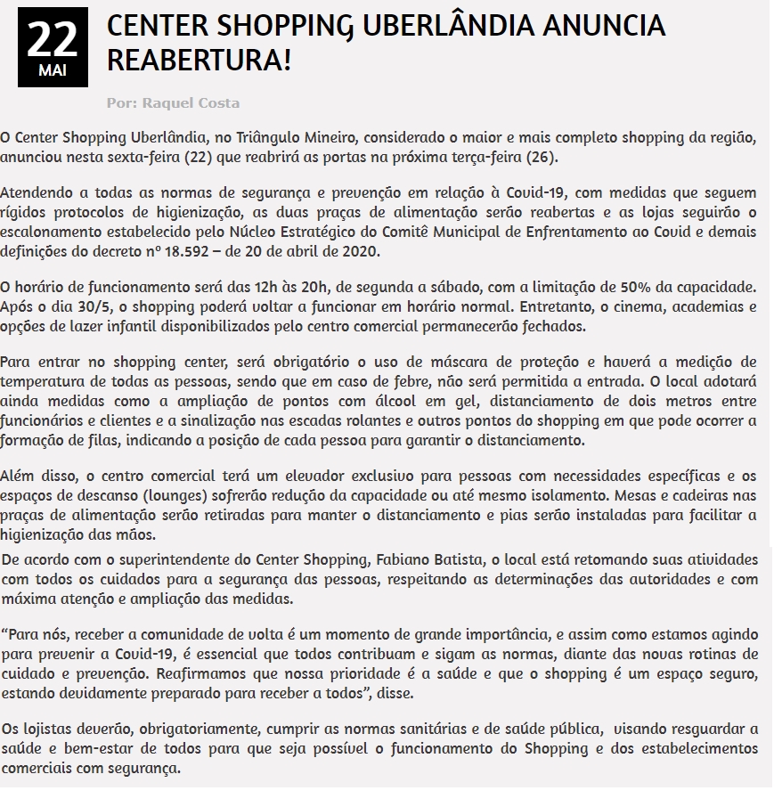 ONLINE - Center Shopping Uberlāndia anuncia reabertura - (22/05)