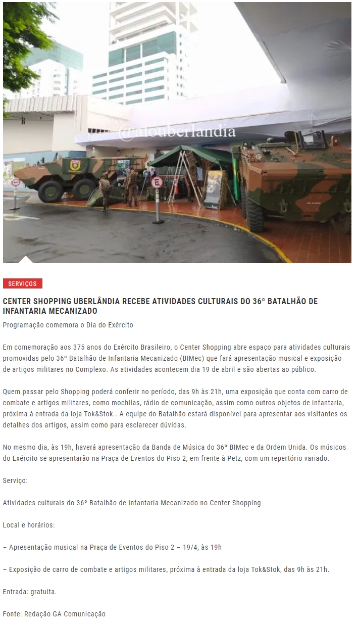 ONLINE-Center Shopping Uberlândia recebe atividades culturais do 36º Batalhão de Infantaria Mecanizado-19.04