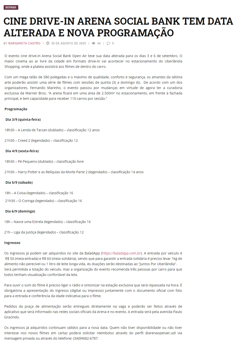 ONLINE - CINE DRIVE-IN ARENA SOCIAL BANK TEM DATA ALTERADA E NOVA PROGRAMAÇÃO - PATROCÍNIO SOCIAL BANK - (30/08)