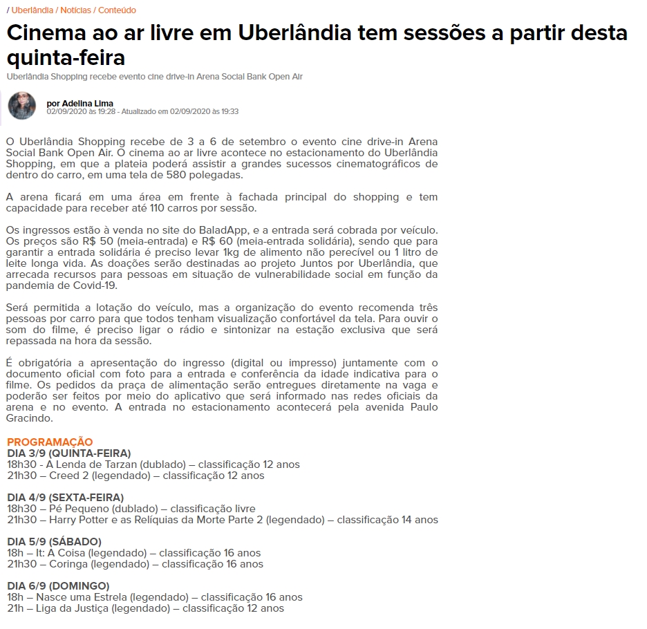 ONLINE - Cinema ao ar livre em Uberlândia tem sessões a partir desta quinta - Patrocínio Social Bank - 02/09