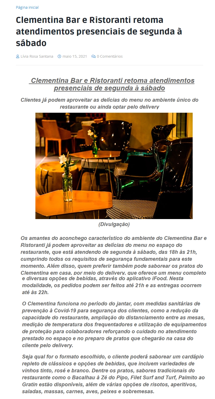 ONLINE - Clementina Bar e Ristoranti retoma atendimentos presenciais de segunda ŕ sábado - 15.5