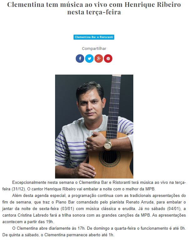 ONLINE - Clementina tem música ao vivo com Henrique Ribeiro nesta terça-feira - 30/12