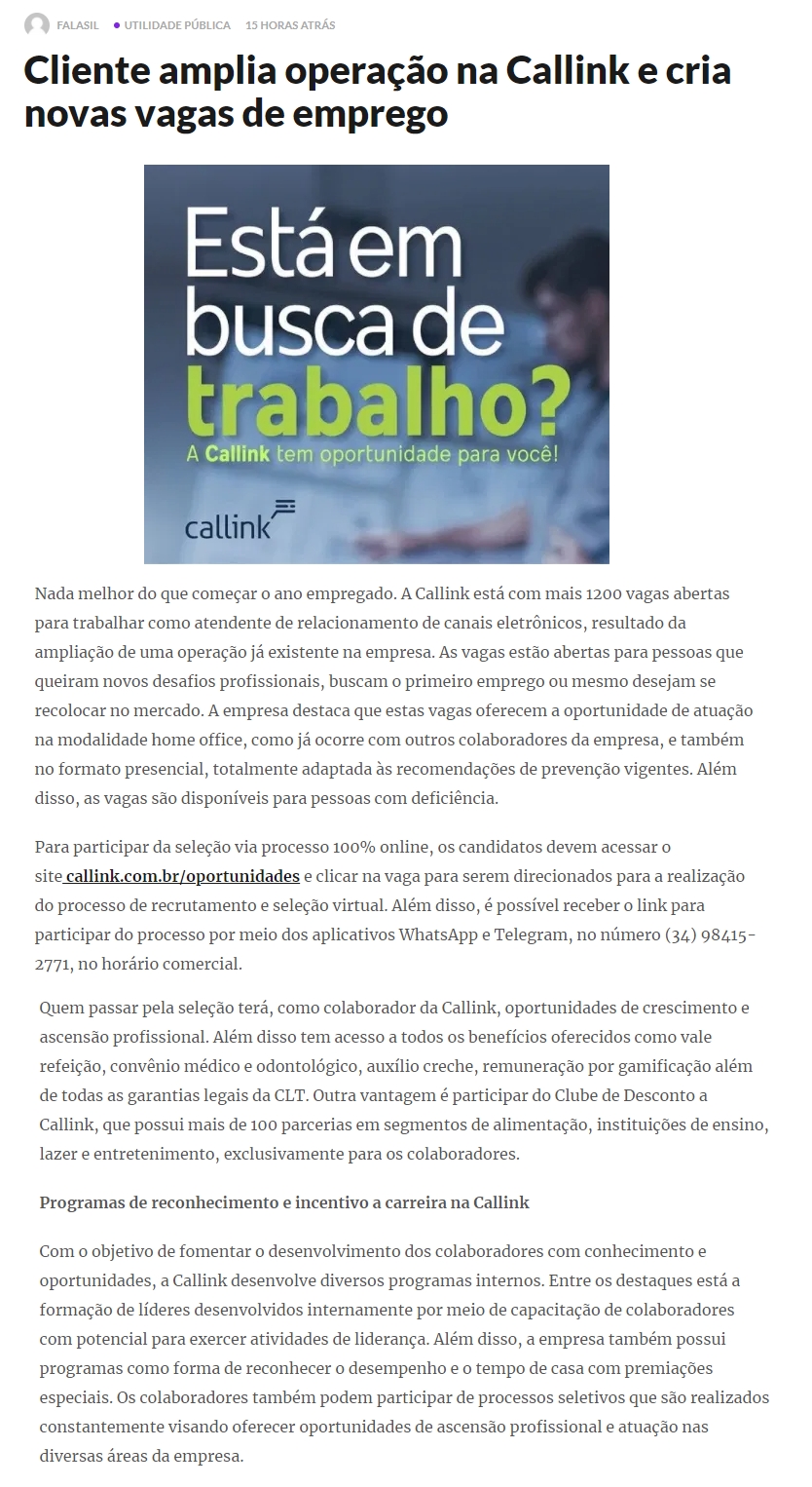 ONLINE - Cliente amplia operação na Callink e cria novas vagas de emprego - 11/01