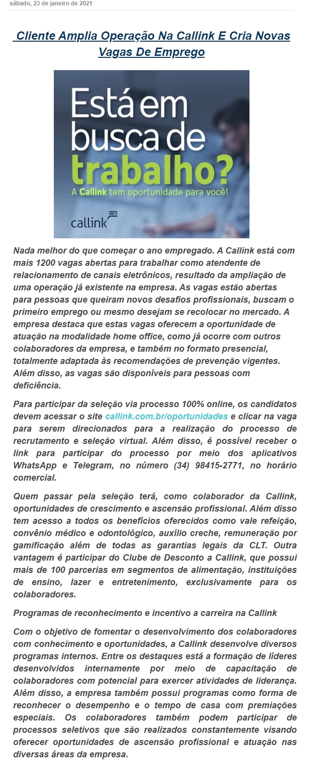 ONLINE - Cliente amplia operação na Callink e cria novas vagas de emprego - 23/01