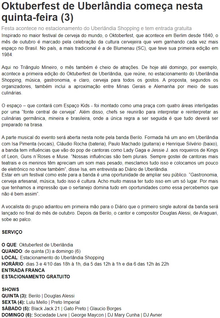 ONLINE - CLIPPING DE INTERESSE - Oktuberfest de Uberlândia começa nesta quinta-feira (3) (03/10)